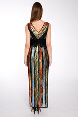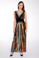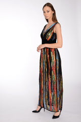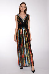 Zjawiskowa sukienka wieczorowa, świetnie podkreślająca talię za pomocą szerokiego paska. Nowoczesna cieniutka plisowana koronka przeplatana jest kolorowymi pasami z cekinów. Długa sukienka świetnie podkreślająca kontur nóg. Dekolt z przodu i z tyłu w kształcie litery V podkreśla kobiece atrybuty. Zapinana z tyłu na zamek. Całość prezentuje się niezwykle elegancko.