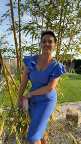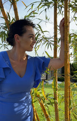 Z tyłu zamek i pęknięcie. Sukienkę zdobią urocze, dwuwarstwowe falbany na rękawach.