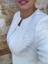Przepiękny płaszczyk wizytowy wykończony aplikacją z ręcznie wycinanej koronki.
