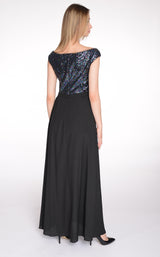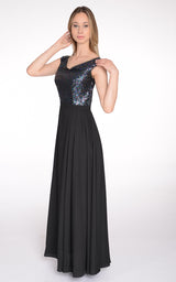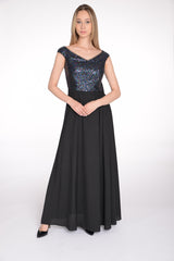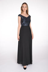 Zwiewna, wieczorowa sukienka z cekinową częścią gorsetową. Precyzyjne cięcia podkreślają mocno talię, dekolt zmysłowo odsłania szyję a rozkloszowany dół pozwala ukryć szersze biodra. Sukienka na podszewce, zasuwana na zamek z tyłu.