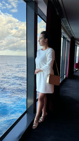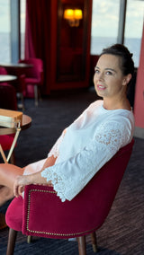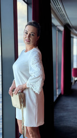 Koronka naszywana na sukienkę jest ręcznie wycinana. Na rękawach dodatkowo tworzy delikatne prześwity.