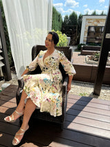 Dzienna, letnia, plażowa, wizytowa. W zależności od okoliczności i okoliczności zmieniających twoje oblicze. Wyjątkowa. Sukienka ma formę kopertową, na dole piękna, zwiewna falbana.